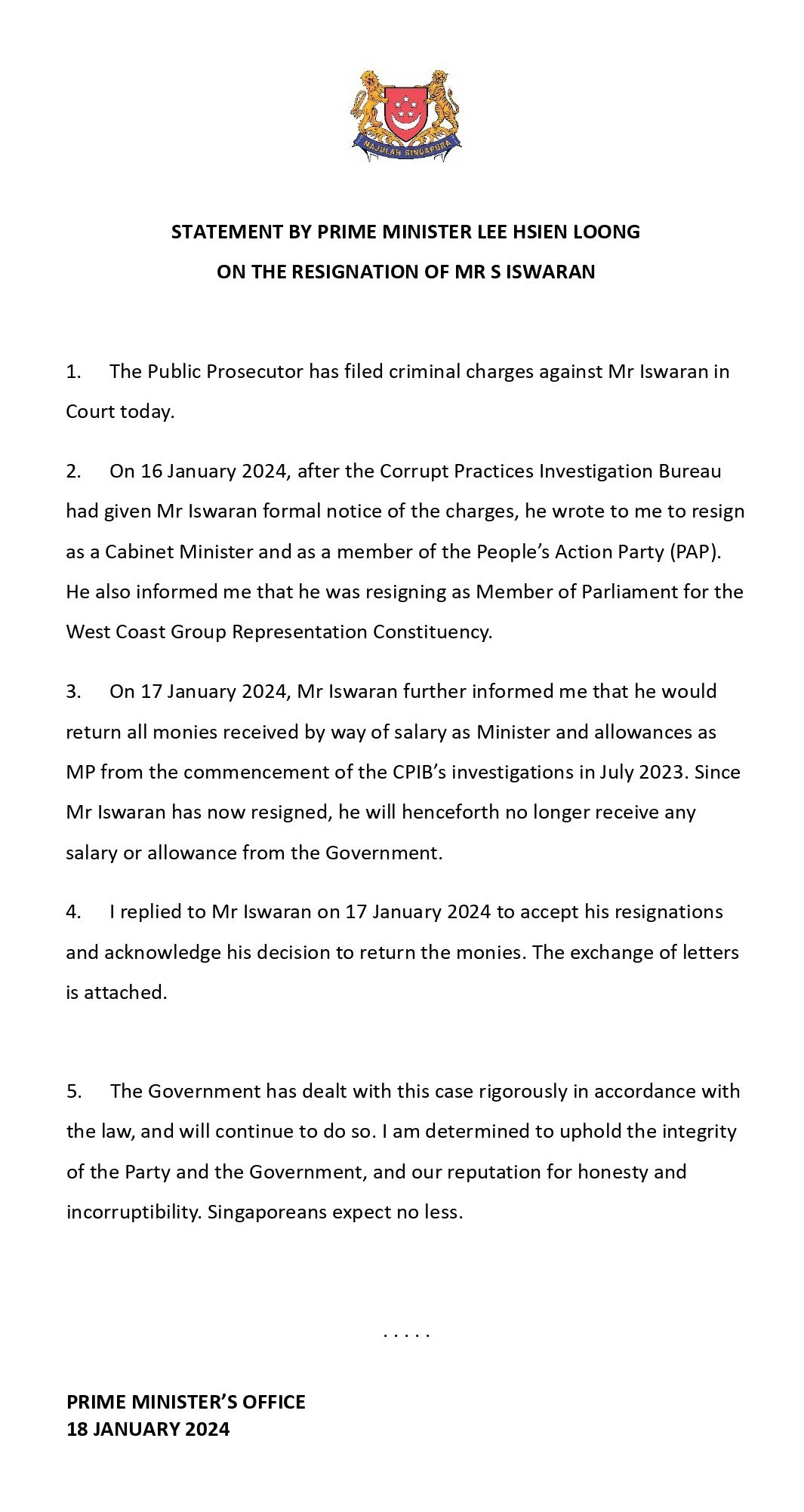 Iswaran is charged in the State Courts. His resignations as transport minister and West Coast GRC MP are announced, with the PMO releasing letters between the former minister and PM Lee.