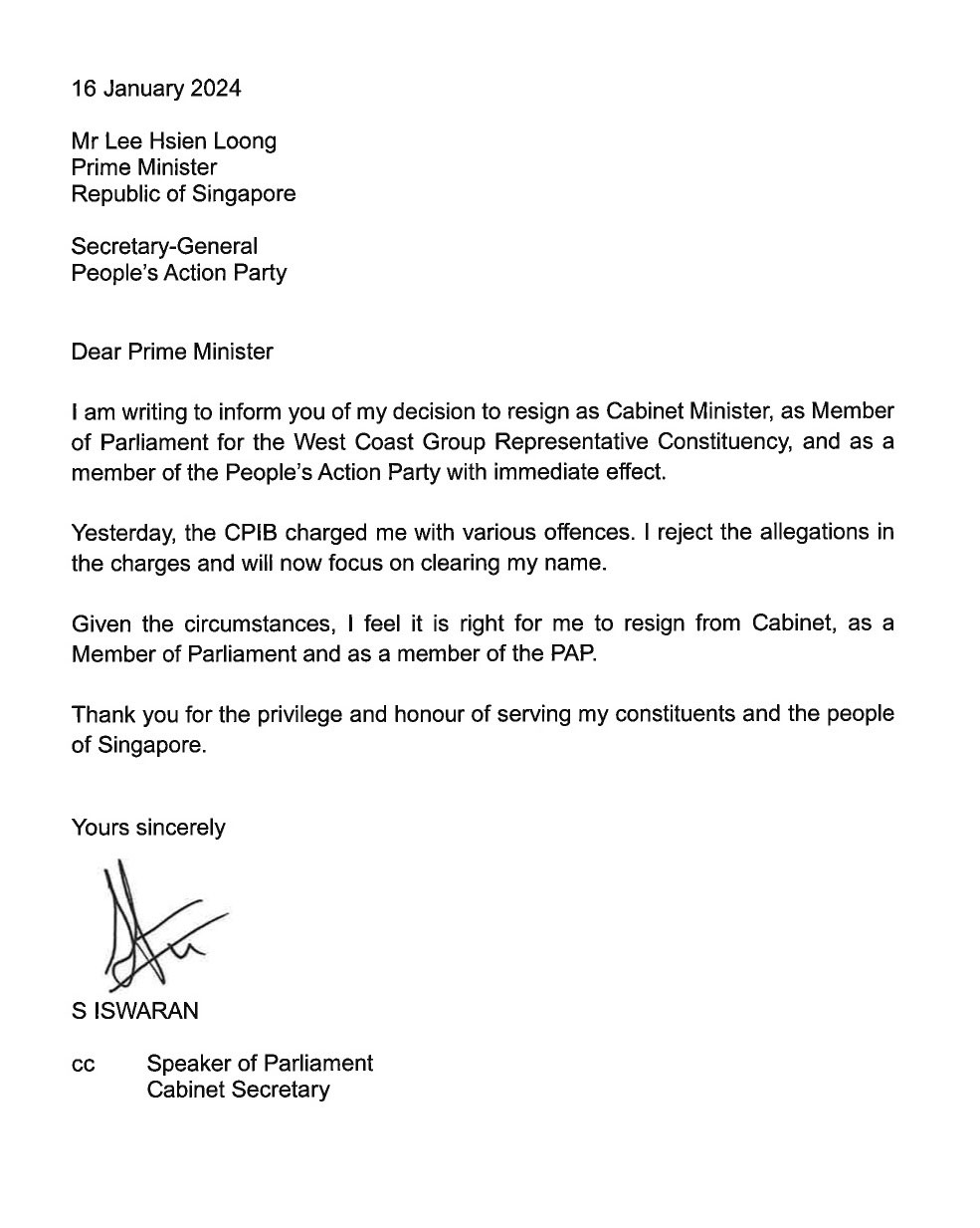 Iswaran writes to PM Lee to inform him about the charges. He says he rejects the allegations and will focus on clearing his name. He also steps down as minister and MP and resigns from the People’s Action Party.
