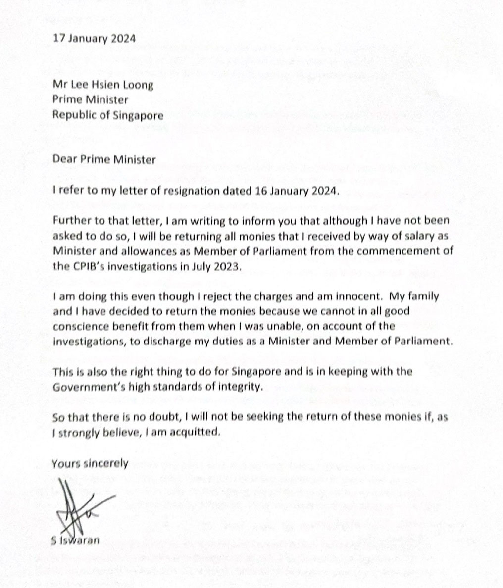 Iswaran writes to PM Lee again to say that he will return all that he received in ministerial salary and MP allowances since the start of the CPIB probe, although he has not been asked to do so.