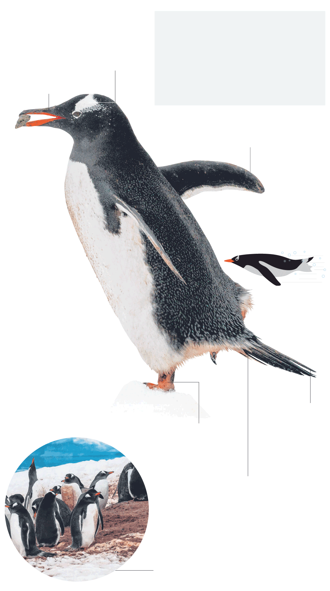 • Gentoo penguins can be found on the Antarctic peninsula and on the sub-Antarctic islands.