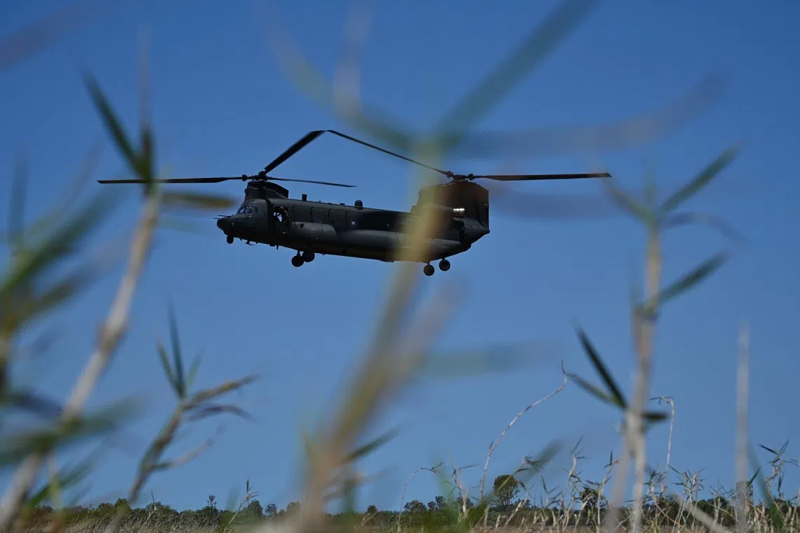 Twin rotors whirring steadily, an RSAF Chinook helicopter prepares to land in the pick-up zone for a troop lift and underslung operation at the 101 SQN/Air Terminal durimg XWB on Oct 26, 2025.