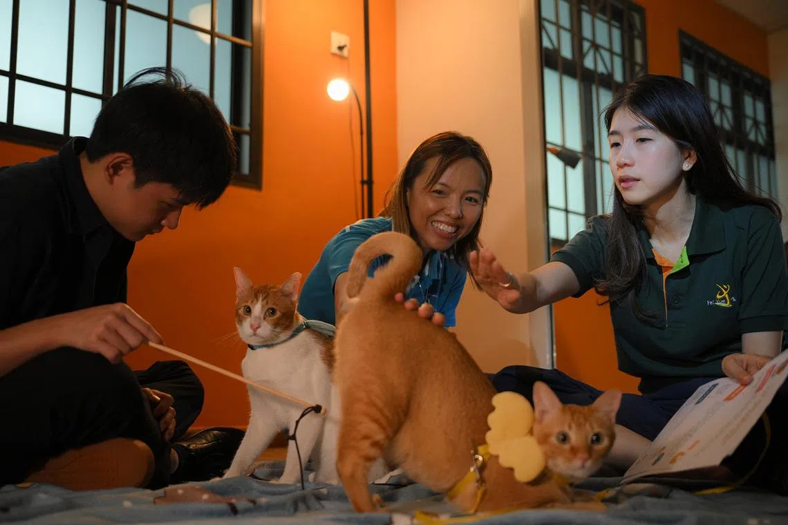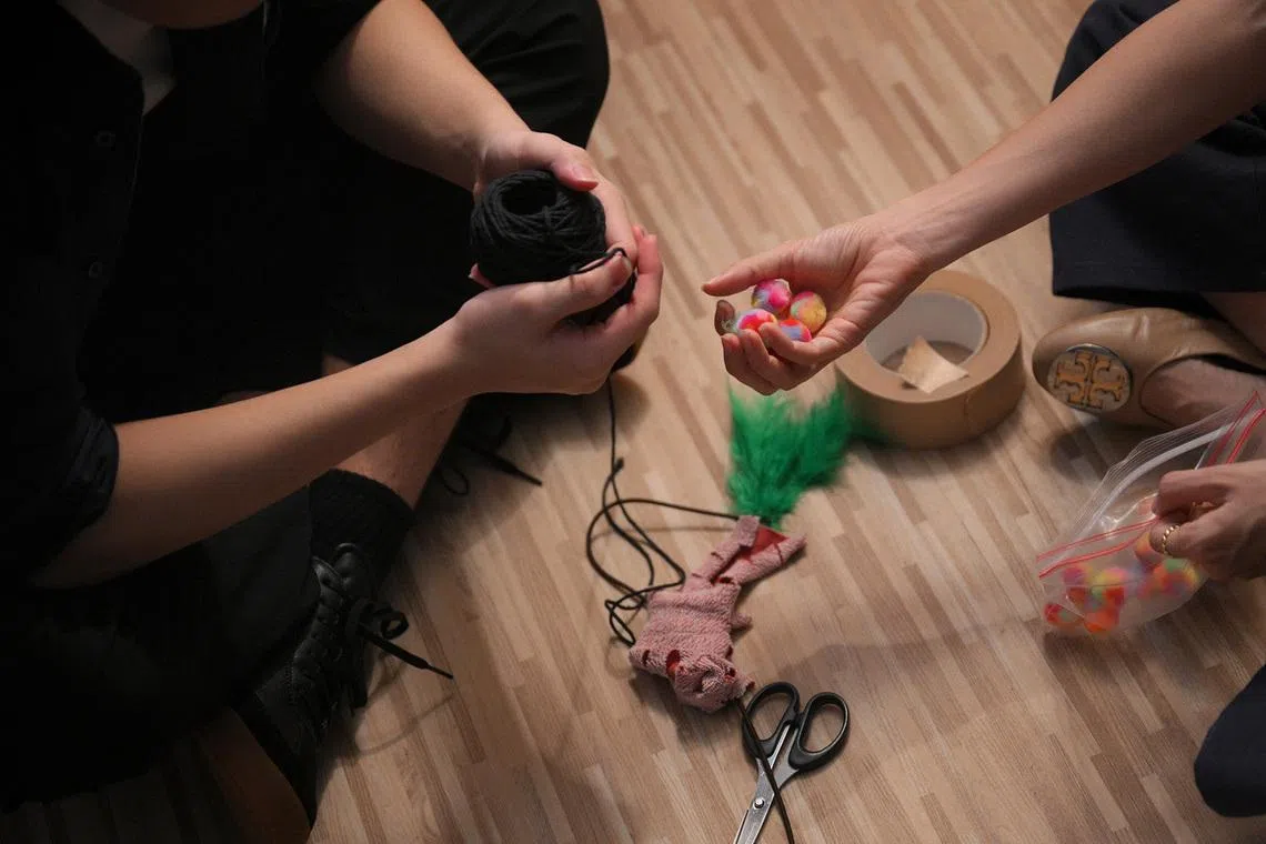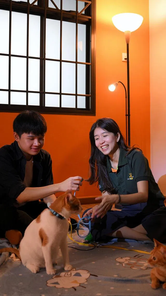 Ms Tee (right) and Zhen Yi making a toy for cats during FYCS’ animal care programme on March 7, 2026.