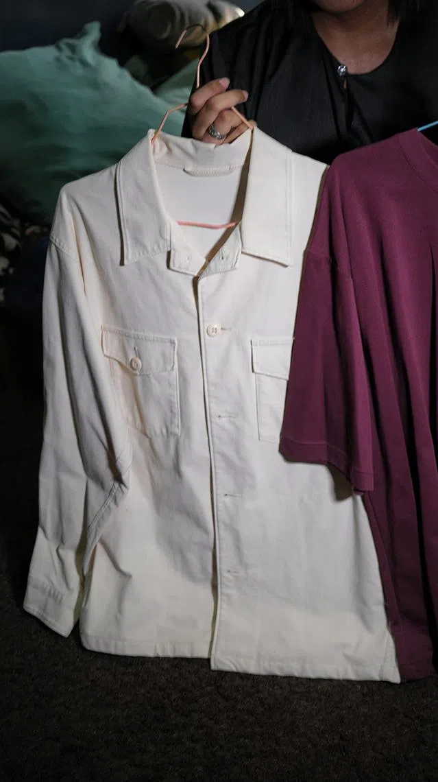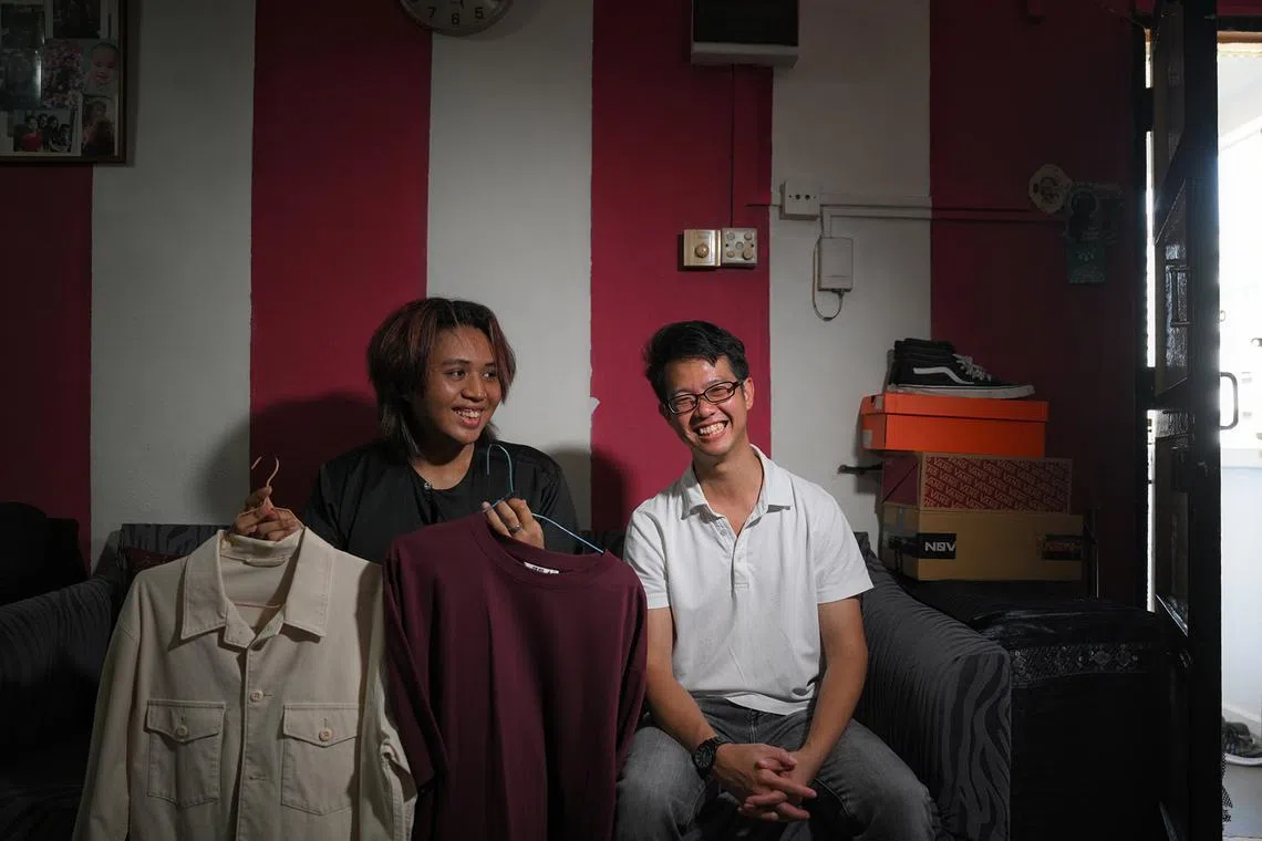 Mr Dzulkarnaen, with Mr Yeo, holding up a cream-coloured jacket and maroon T-shirt – clothing with “colours and styles outside of his comfort zone” – that he bought from Uniqlo during a “retail therapy” session with FYCS.