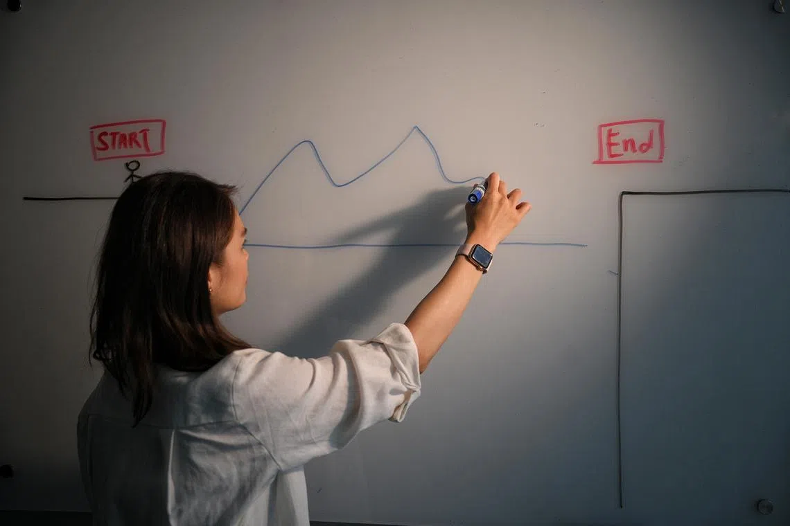Ms Ng using an iceberg drawing as a visual aid to help women make sense of leaving abusive relationships. She invites them to reflect on where they see themselves in the diagram, whether at the starting point, within the uncertainty, or moving towards a sense of resolution.