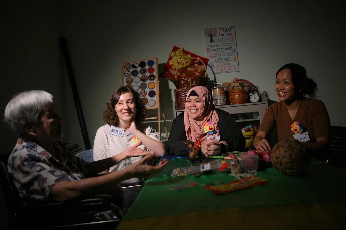 Medical social workers (from second left) Louisa Bielig, Nur Sahara Kamsani and Siti Aisyah Ismail at a reminiscence session with an elderly resident at Ren Ci @ Bukit Batok St. 52 nursing home on March 12, 2026.