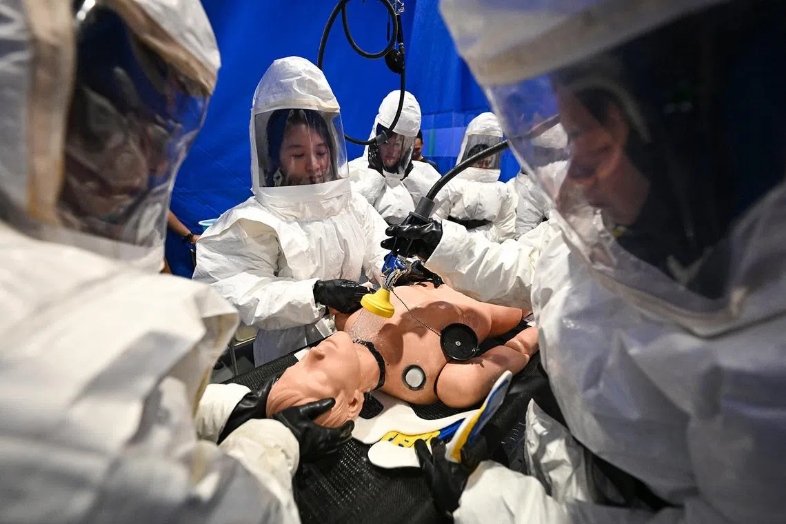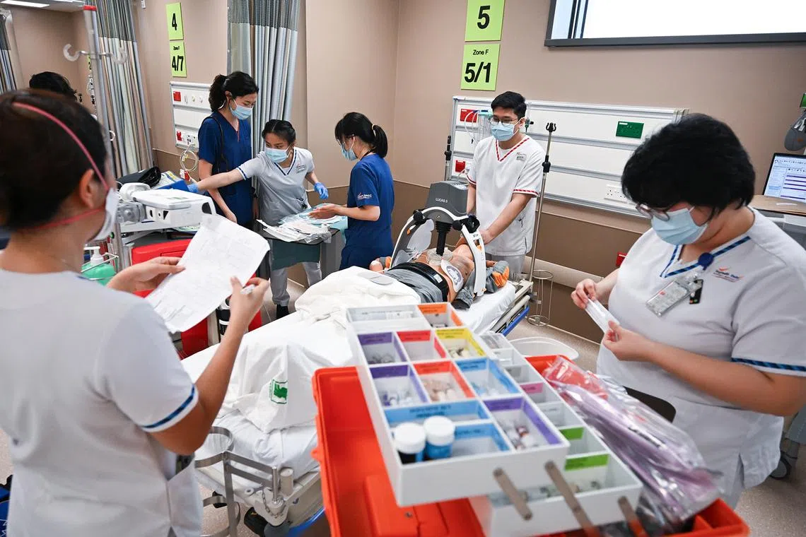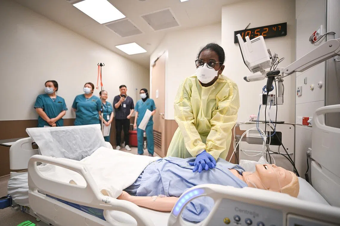 During the Emergency Department (ED) Combined Full-Dress Rehearsal, enrolled nurse E. Arachchige Udulee Wathsala Indeewaree Amarasekaraa performing resuscitation on a “patient” who displayed signs of acute pulmonary edema, in the isolation area on level 3 of the new SGH EM/NNI building on Oct 31, 2025.