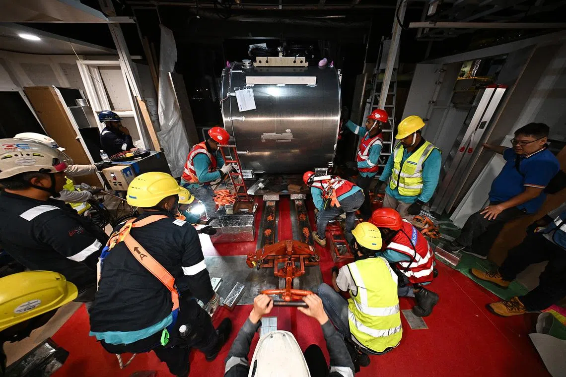 Mr Liang Dianhui, 42, senior manager of facilities management and engineering at SGH, said: “Strong winds could cause the magnet to sway during hoisting, so if there was rain or lightning, the hoisting would have to stop or even be postponed.”
