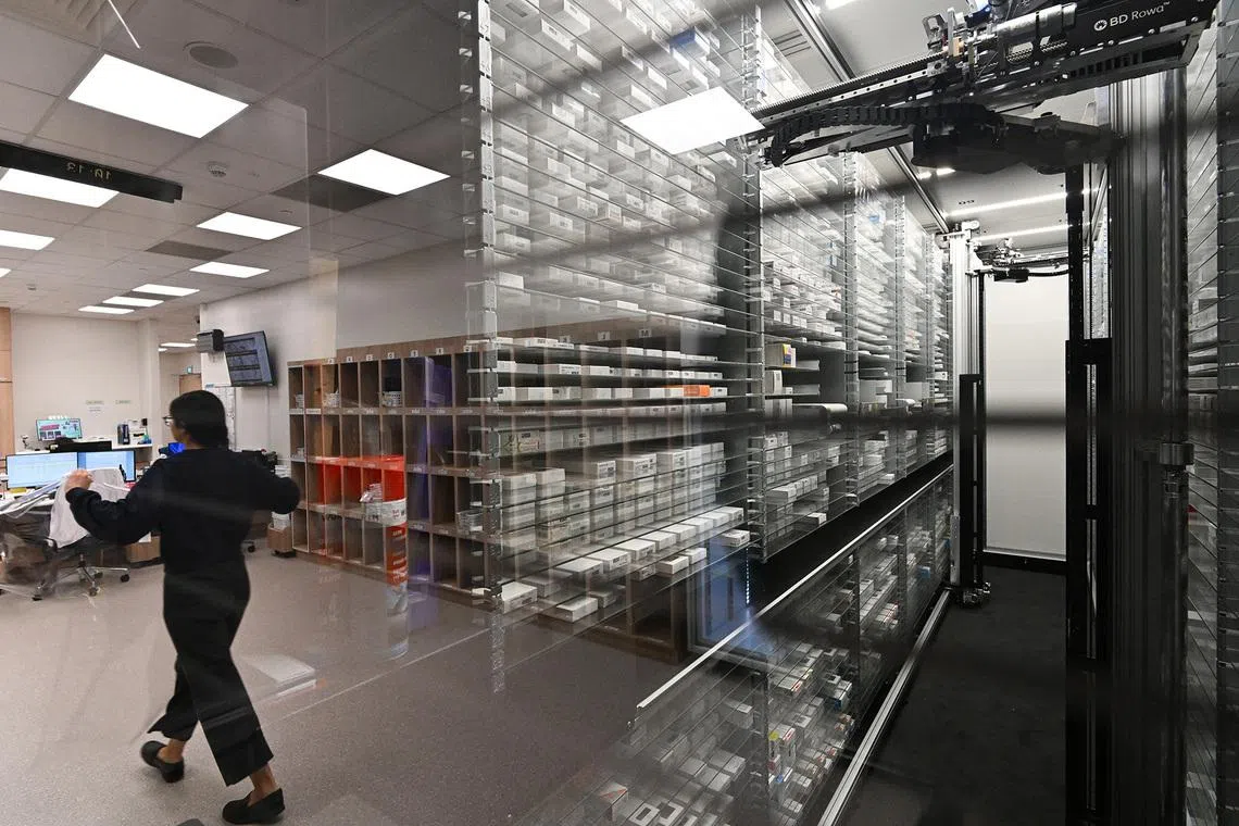 Staff working inside the pharmacy at level 1 within the SGH EM/NNI building, which features an automated storage and retrieval system. Medications are stored in compact, space-efficient shelving, and retrieved quickly and accurately through barcode scanning and robotic system when prescriptions are filled.