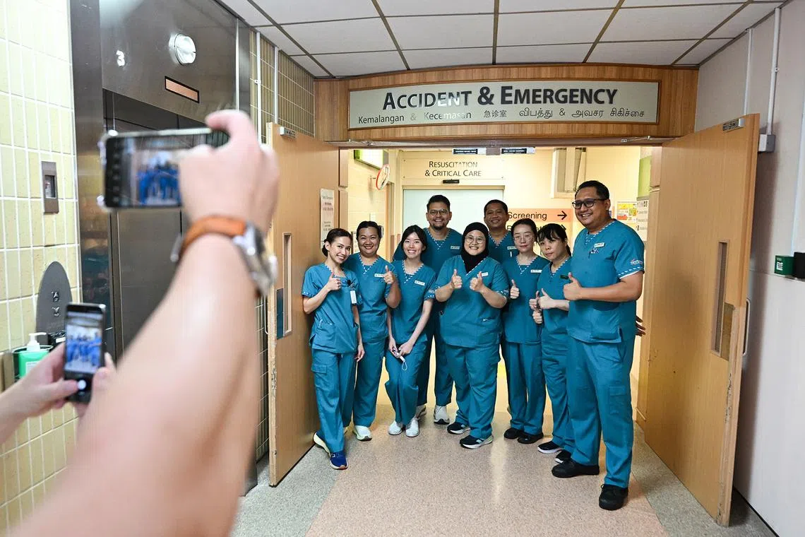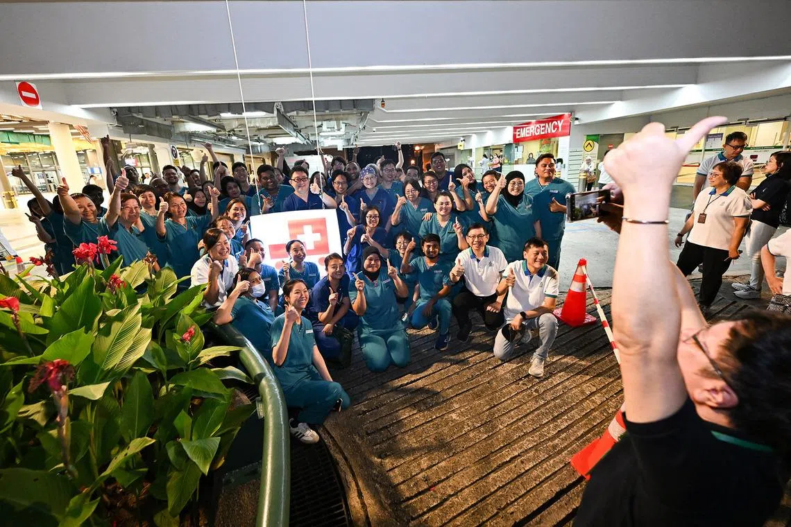 The last batch of nurses working at the old emergency department – from 7am to 4pm – as the rest of their colleagues moved to the new place, taking a group photograph on Jan 18, 2026. They had to help move the remaining patients to the wards and do a final sweep of the area, transferring equipment and tidying up the place, which has since been repurposed as inpatient wards.