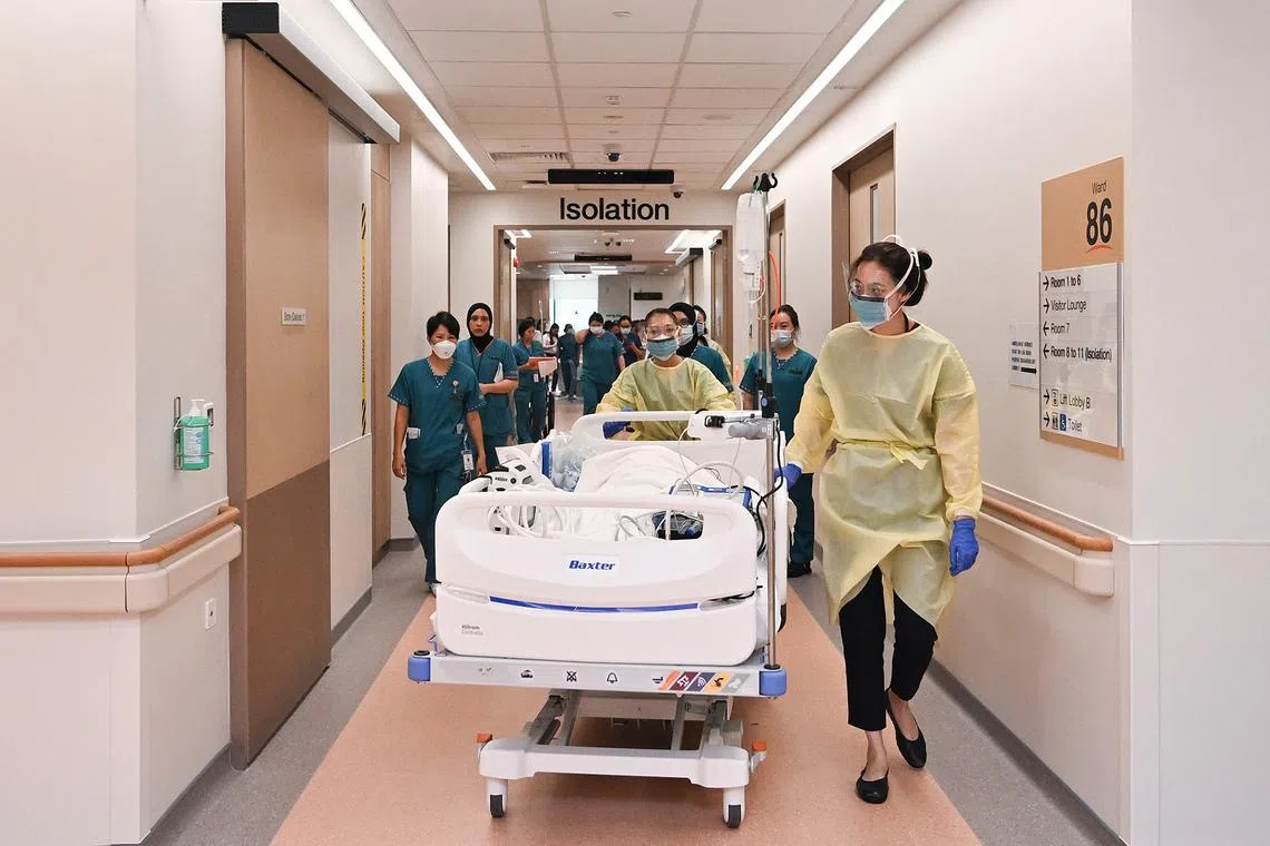 The rehearsal “patient” being transferred by Senior Staff Nurse Naw Noreen and Dr Tang Shin Yee (foreground) to the medical intensive care unit (MICU) at Block 4 Level 5 of Singapore General Hospital after undergoing resuscitation on Oct 31, 2025.