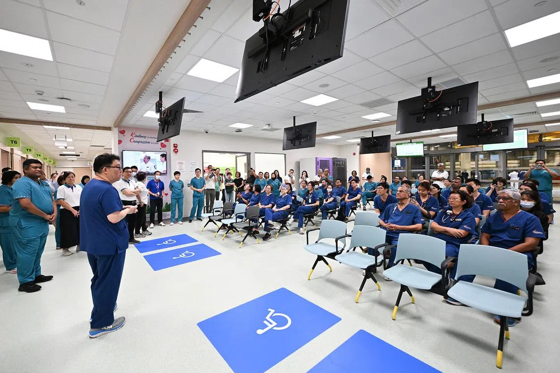 Senior consultant from the Department of Emergency Medicine Kenneth Tan speaking to his staff in the new SGH EM/NNI building on Jan 18, 2026.