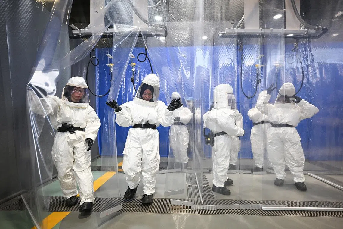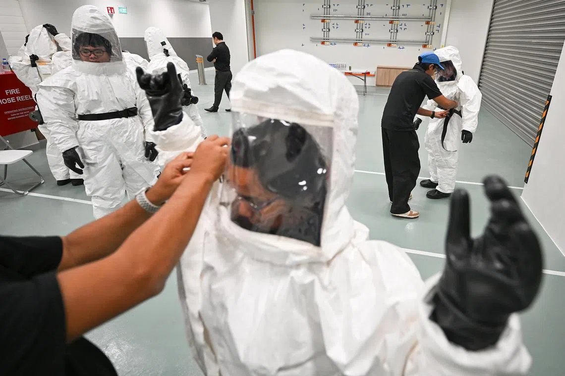 SGH Campus staff who had been nominated or had volunteered to be part of the Hospital Decontamination Station (HDS) team putting on HDS suits during training at the HDS Coordination Centre (HCC), located on level 3 of the new SGH EM/NNI building, on Feb 20, 2025.