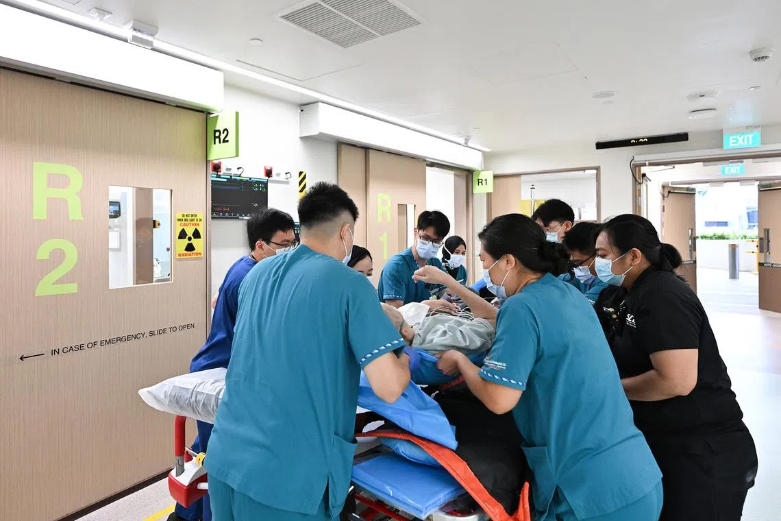 The patient from the first ambulance arriving in the new emergency department being transferred at the resuscitation area in the new SGH EM/NNI building at 8.33am on Jan 18, 2026.