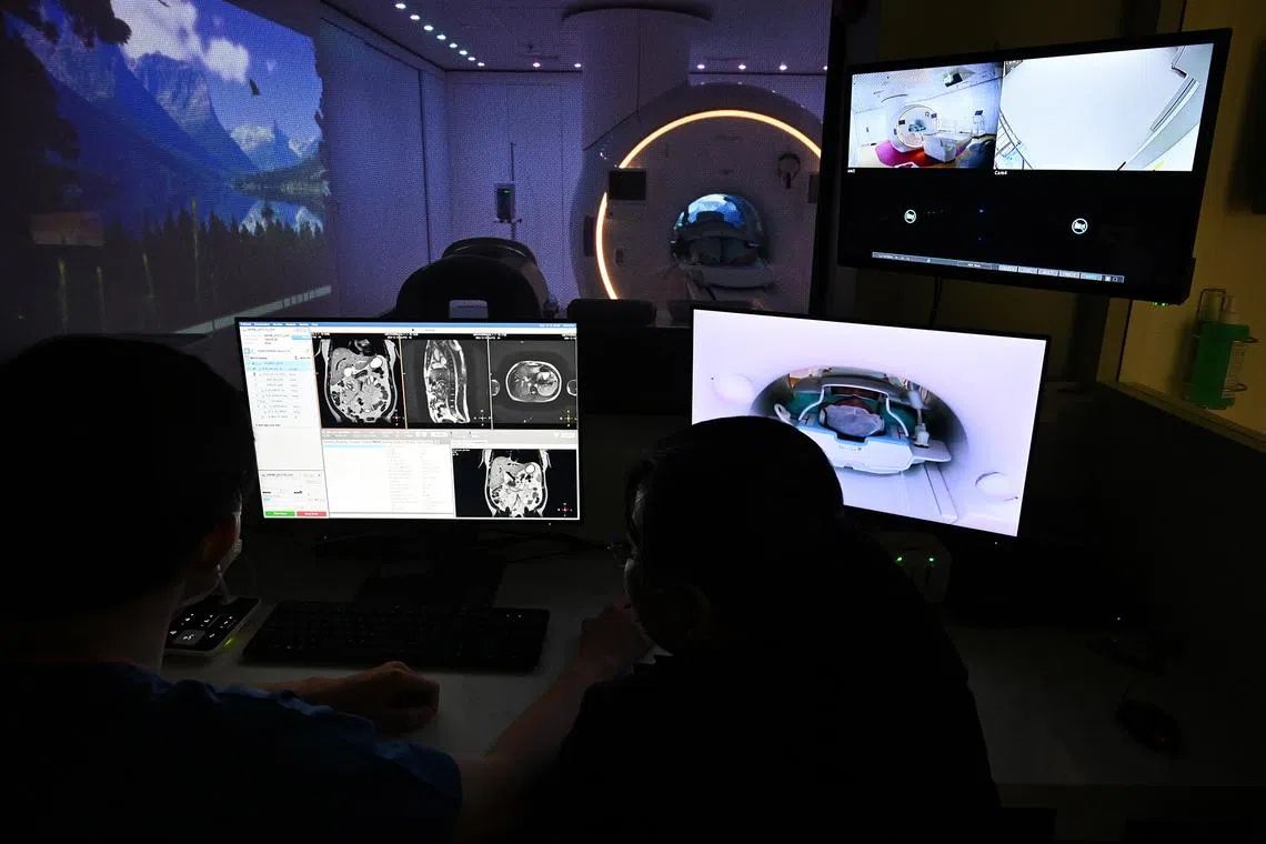 Radiographers monitoring the screens showing the MRI results and patient’s reactions to the visual stimulation during MRI training for radiographers in the Magnetic Resonance Imaging (MRI) room on level five of the new SGH EM/NNI building on Dec 13, 2024.