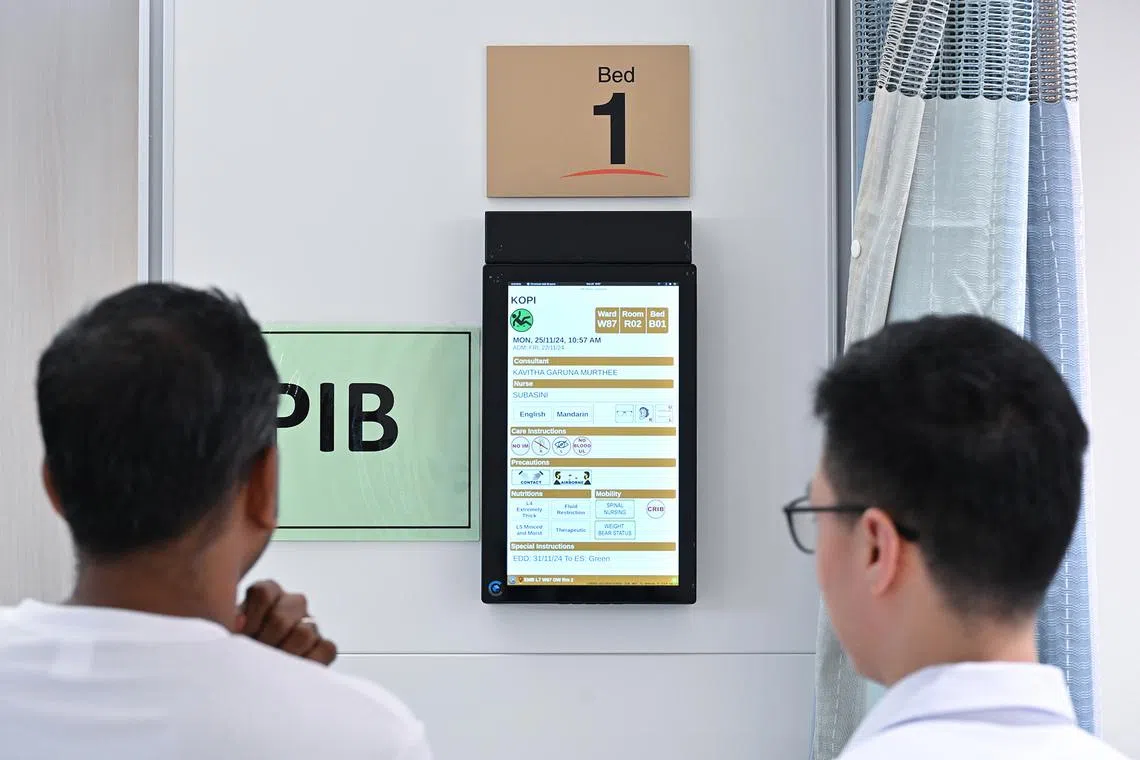 An information screen at the bedside of a patient in ward 87 during a full-dress rehearsal for phase 1 of the opening of the SGH EM/NNI building on Nov 25, 2024. This solution replaces the manual patient information boards installed at inpatient bedheads with digital ones, giving healthcare providers quicker access to essential patient information.
