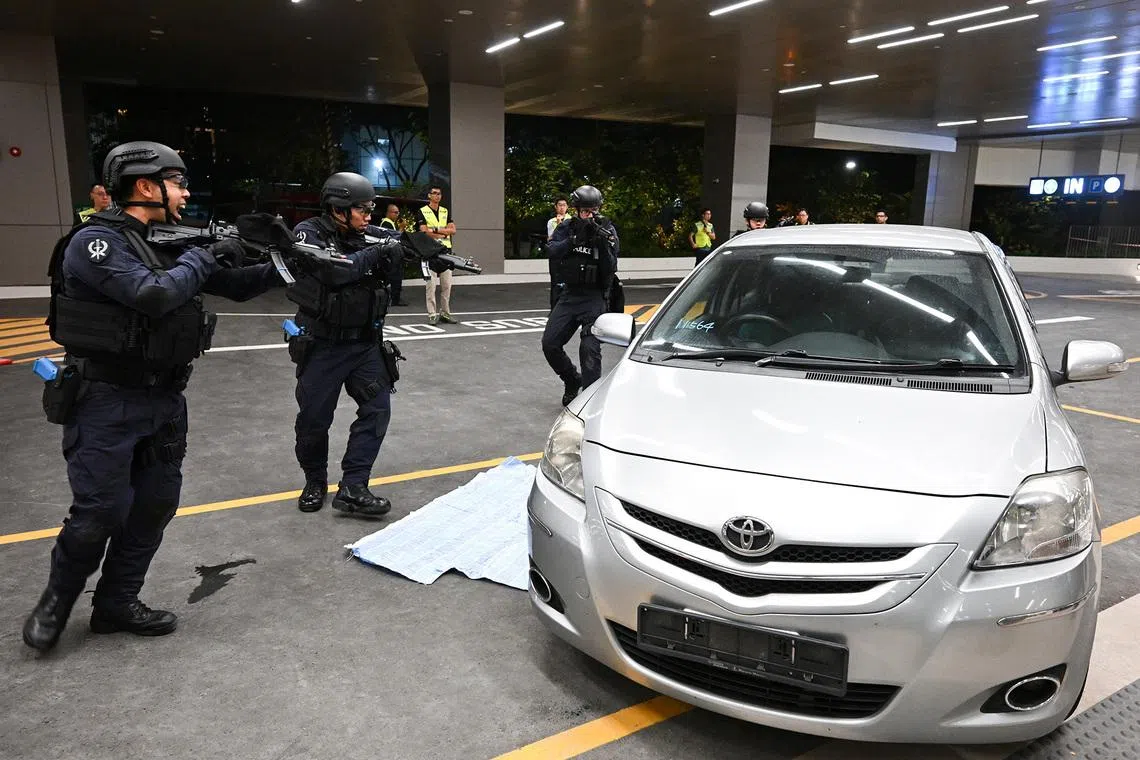 Emergency Response Team (ERT) officers surrounding the car where the gunman was hiding during the public security ground deployment exercise at the new building on Nov 9, 2024.