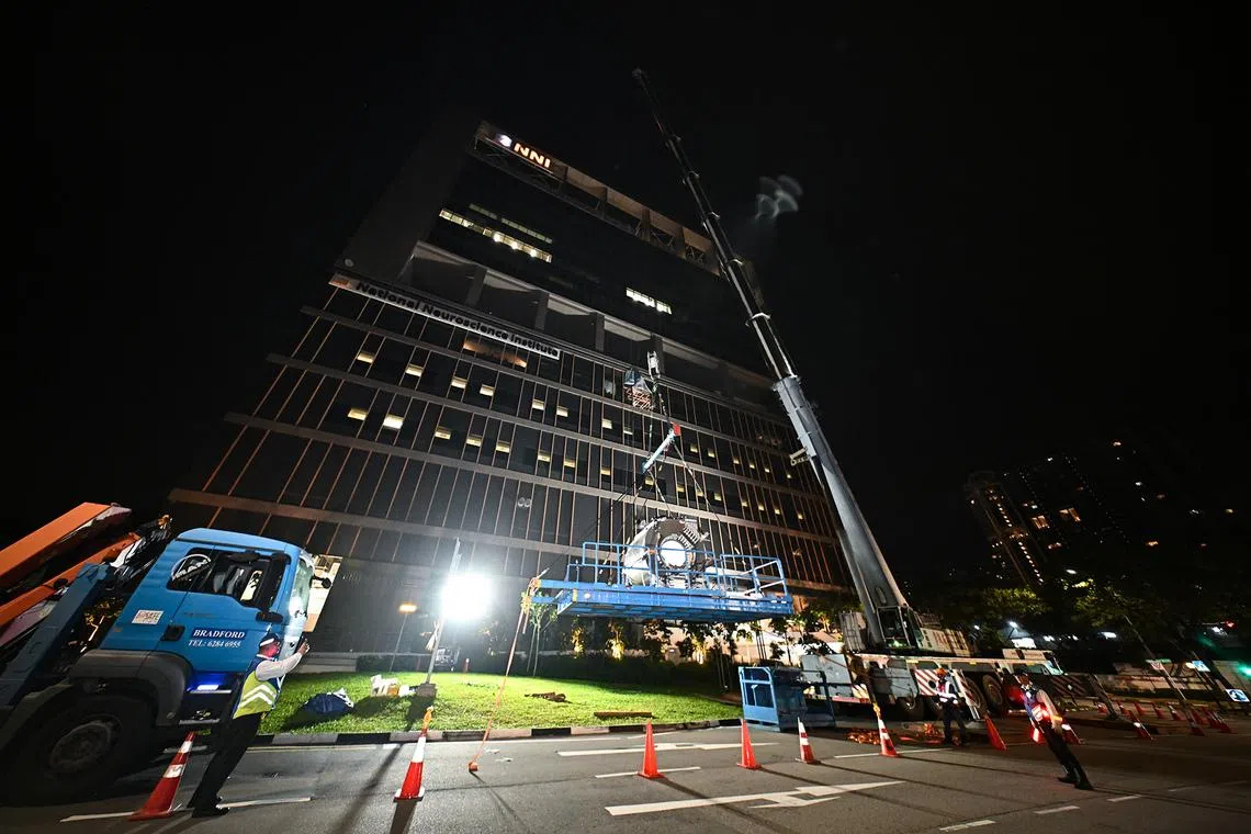 Workers trying to move the main magnet of the MRI machine into the fifth floor through a hole in the new SGH EM/NNI building after midnight on July 14, 2024.