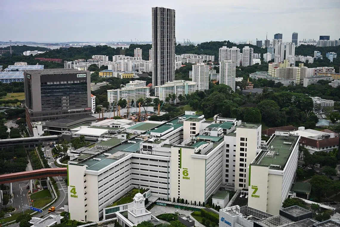 The new SGH EM/NNI building (top left) and Singapore General Hospital as viewed from National Cancer Centre Singapore (NCCS) on July 15, 2025.
