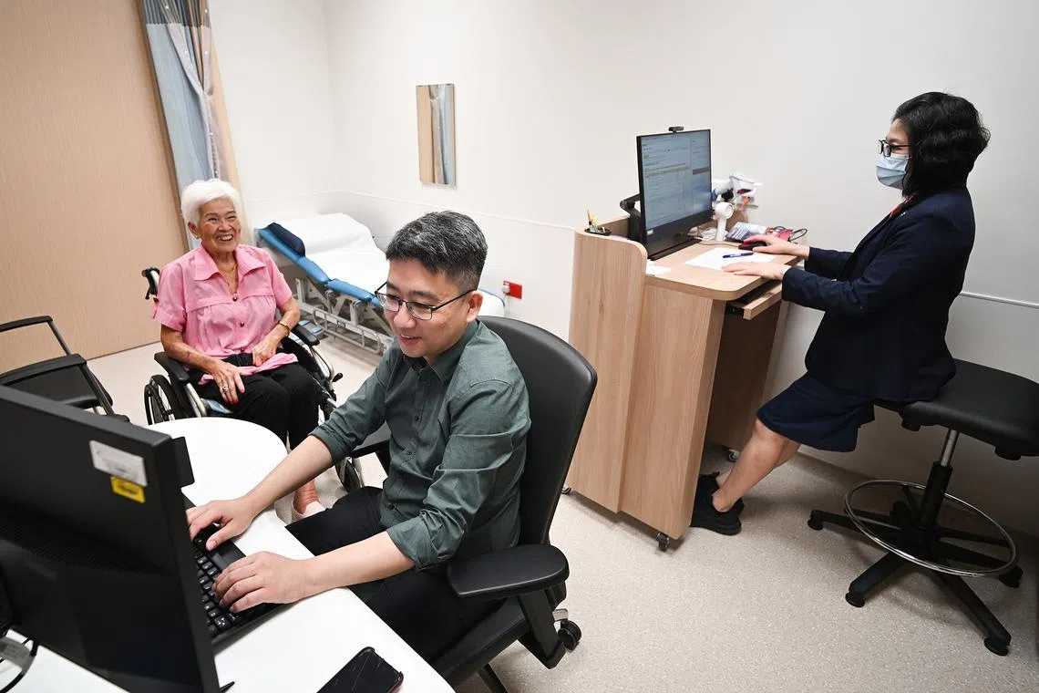 Madam Ma Than Tin d/o Maung Maung, 83, a retiree, in a consultation with Dr Yong Kok Pin, senior consultant, Neurology, National Neuroscience Institute, and Madam Wang Soo San, patient service associate executive, inside the Neuroscience Clinic (SGH) on the first day of operations at the new SGH EM/NNI building on Jan 5, 2026.