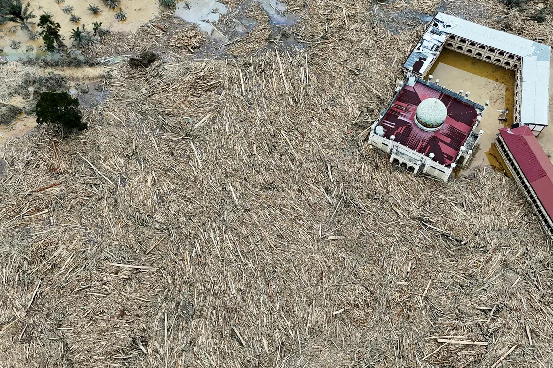A drone view showing a mosque and a boarding school in an area affected by a deadly flash flood following heavy rains in Karang Baru, Aceh Tamiang regency, Indonesia, on Dec 6, 2025.