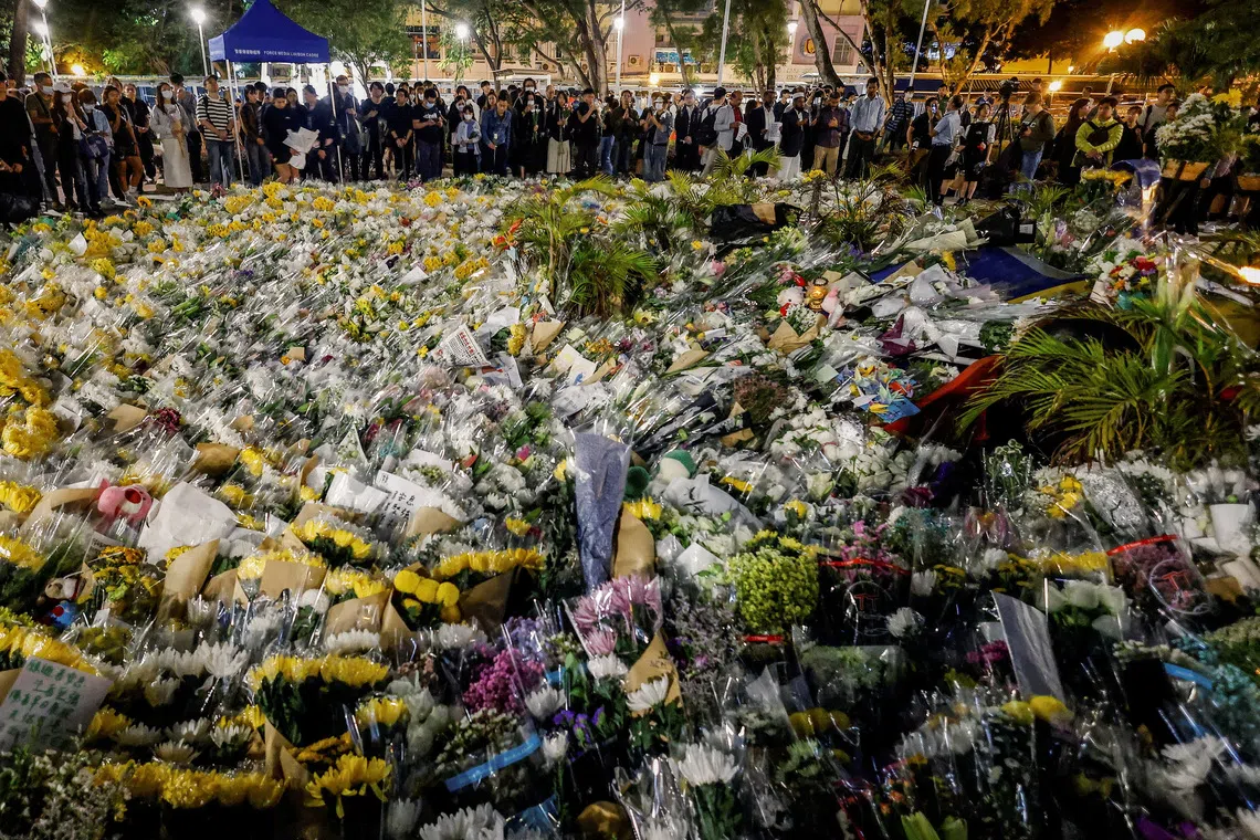 People gathering next to a pile of flowers at a makeshift memorial in a small park near the Wang Fuk Court housing complex, after the deadly fire in Tai Po, Hong Kong, on Dec 1, 2025.