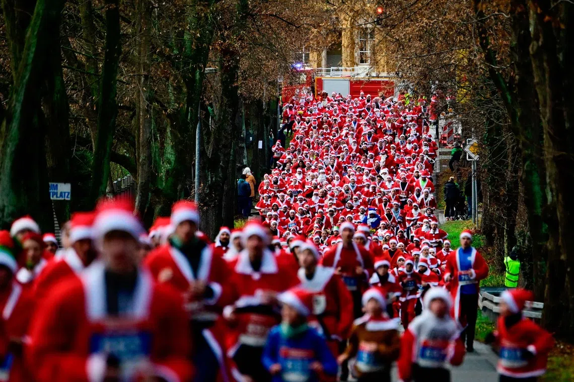 Participants wearing Santa Claus costumes taking part in the 17th Michendorfer Nikolauslauf fun run in Michendorf, southwest of Berlin, Germany, on Dec 7, 2025.
