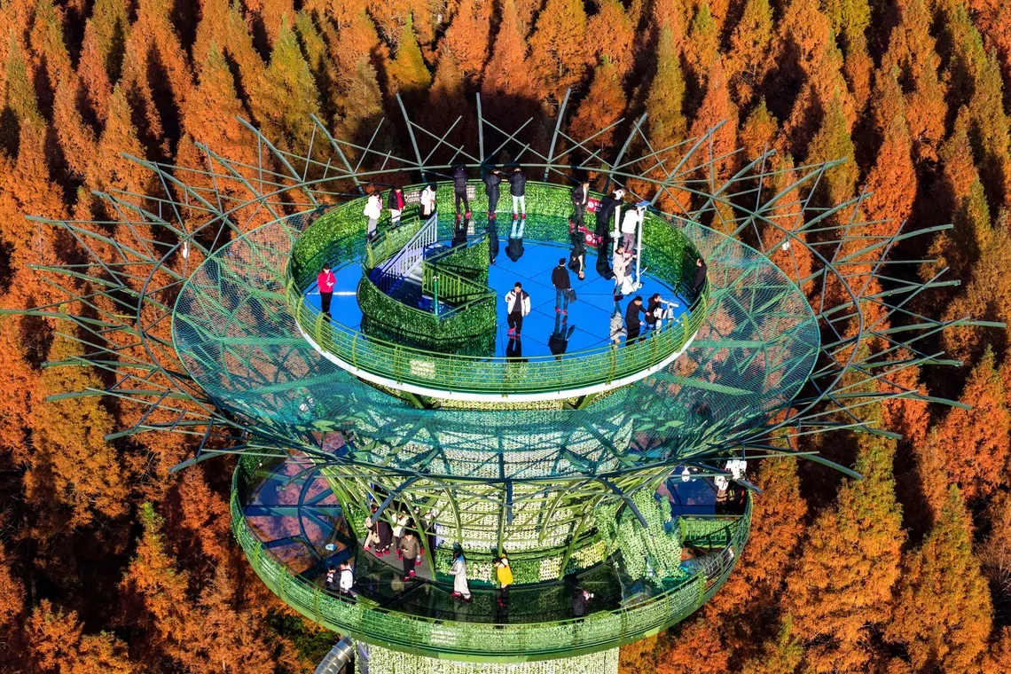 Visitors admiring the Yellow Sea Forest Park as the leaves of dawn redwoods turn red and yellow in winter in Yancheng, eastern China’s Jiangsu province, on Dec 4, 2025.