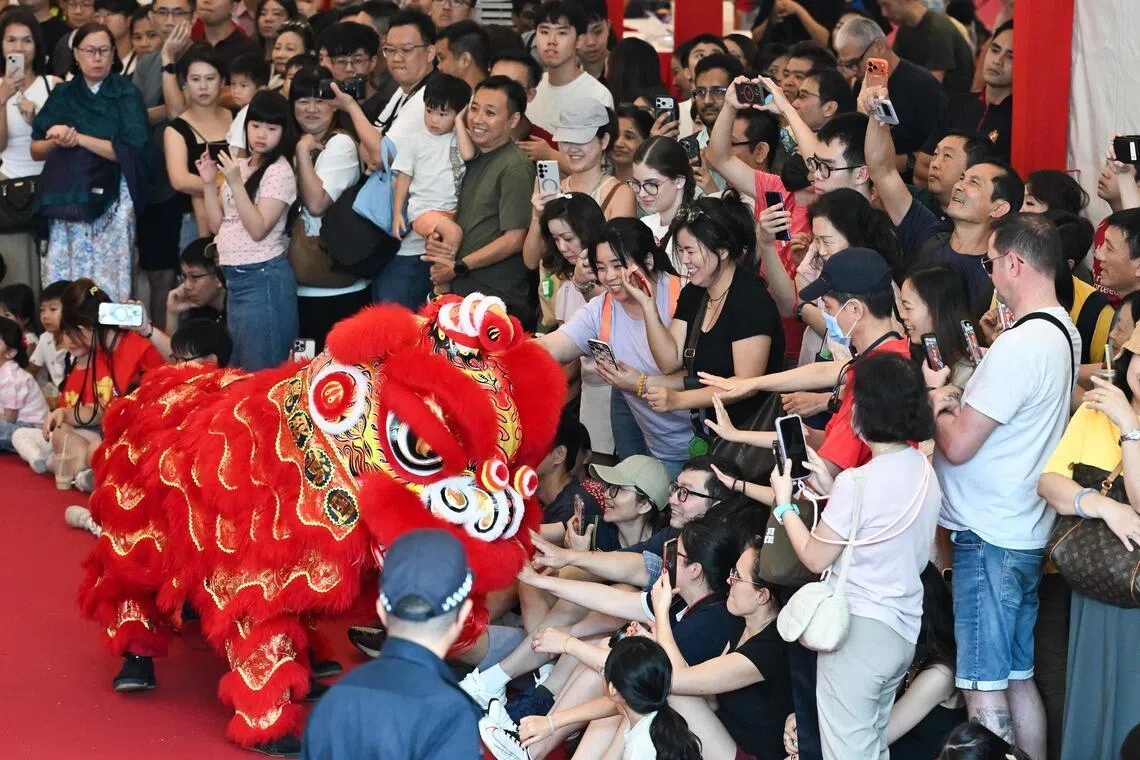 A lion from the NUS Lion Dance troupe interacting with visitors at the Istana’s open house during a Chinese New Year cai qing (plucking of greens) performance.