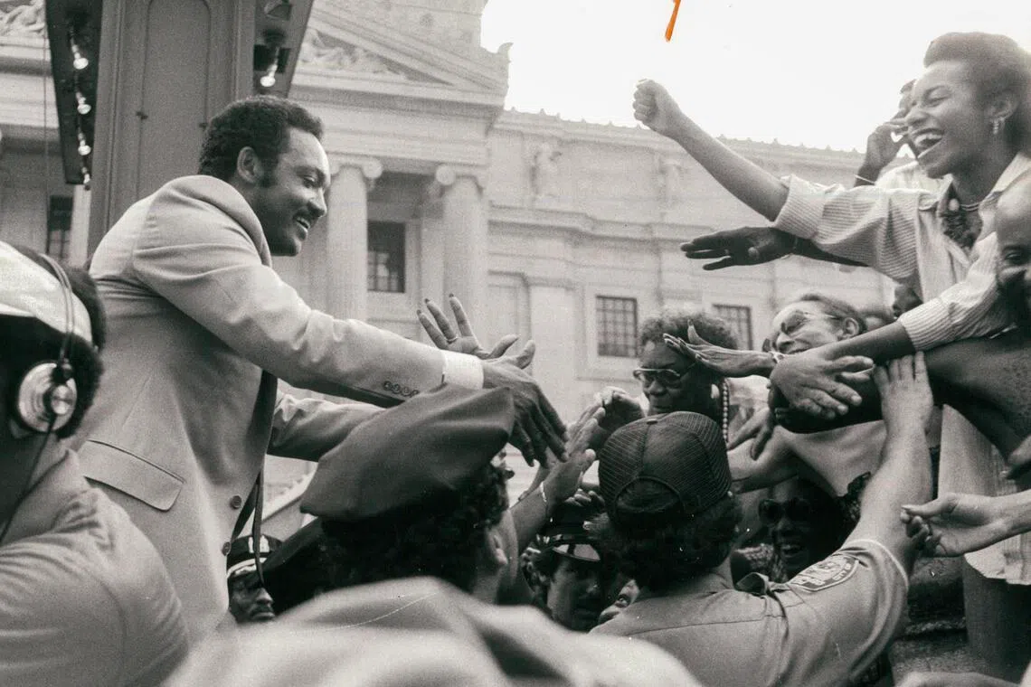 American civil rights activist Jesse Jackson greeting well-wishers at a voter registration drive event outside the Brooklyn Museum on Sept 3, 1984. Reverend Jackson, one of America’s most influential African-American figures, died today at 84.