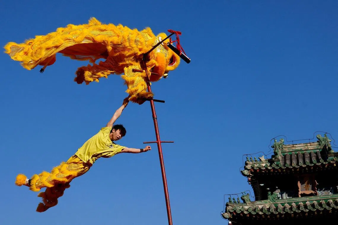 Lion dance performers leaping through the air during celebrations at Dongyue Temple in Beijing, China, on the first day of Chinese New Year.