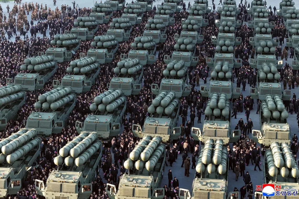 People viewing 600mm calibre multiple rocket launchers during a presentation ceremony of the weapons at the Ninth Congress of the Workers’ Party of Korea in Pyongyang, North Korea.