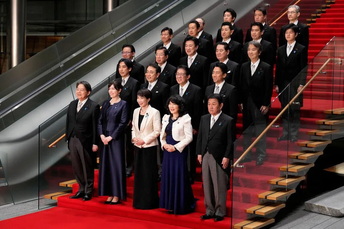 Japanese Prime Minister Sanae Takaichi (front row, centre) and members of her new Cabinet posing for a group photo in Tokyo, Japan.