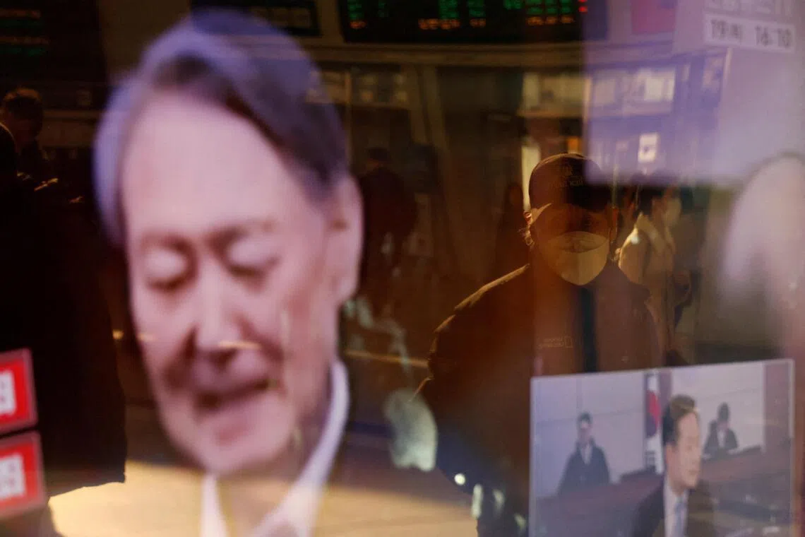 News reports flashing on public screens after a court sentenced former South Korean president Yoon Suk Yeol to life in prison following a guilty verdict in his insurrection case in Seoul.