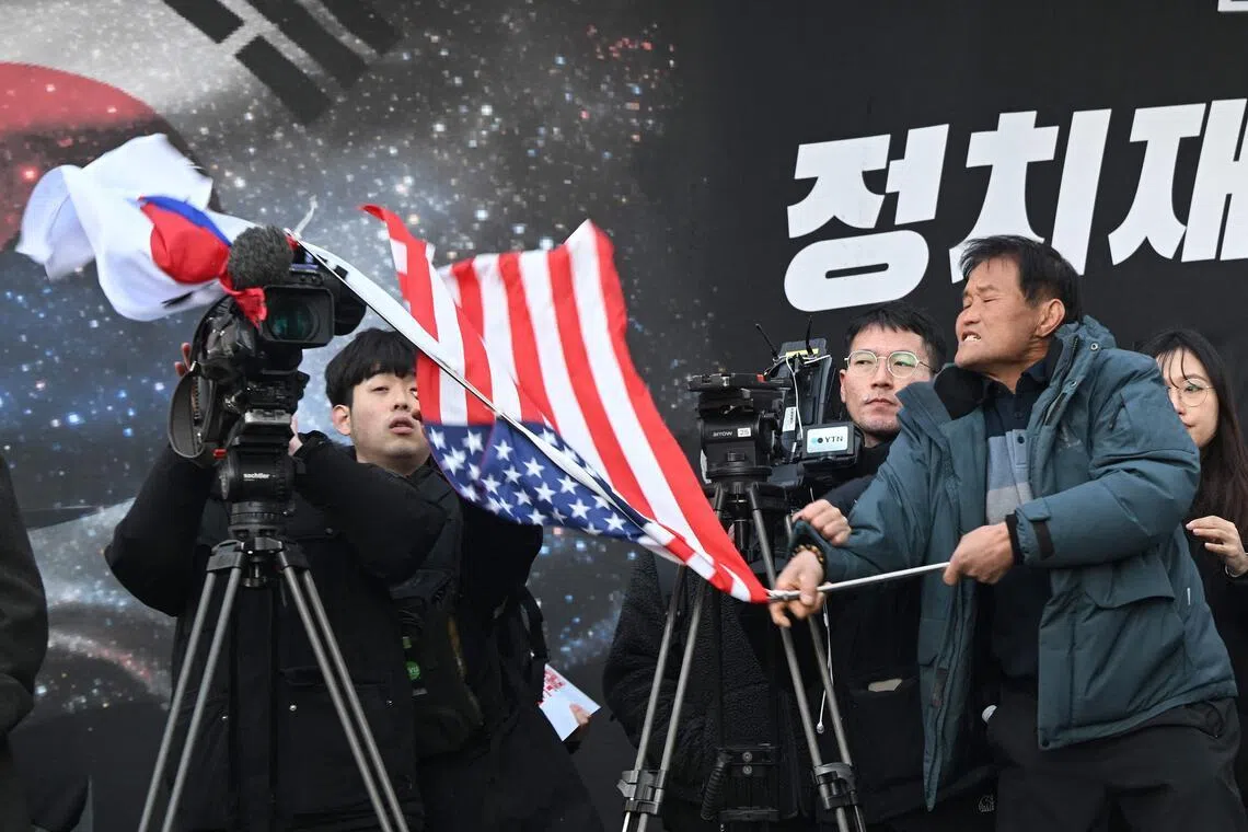 An angry supporter of former South Korean president Yoon Suk Yeol striking a camera with a flagpole as supporters watch a live stream of Yoon’s trial over his insurrection charges near the Seoul Central District Court.