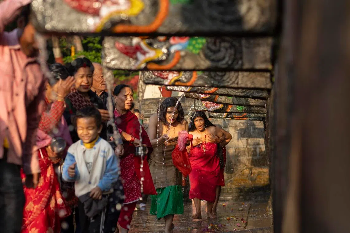 Hindu devotees bathing under 22 water spouts during Balaju Purnima, a full moon festival, in Kathmandu, as thousands gather for a ritual bath in the hope of protection from skin diseases and a better life.