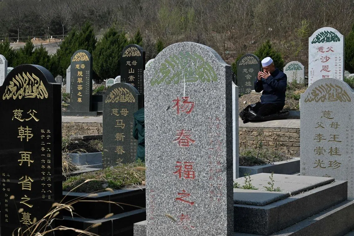 A Muslim man offering prayers at an ethnic Hui cemetery on the eve of the Qing Ming Festival, also known as the tomb-sweeping festival, in Beijing.