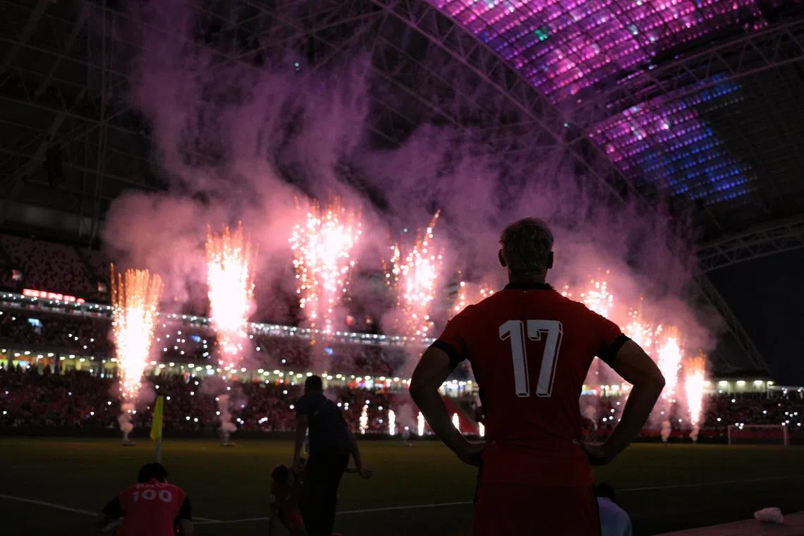 Singapore national footballer Irfan Fandi looking on as pyrotechnics light up the National Stadium after the Asian Cup qualifier against Bangladesh.