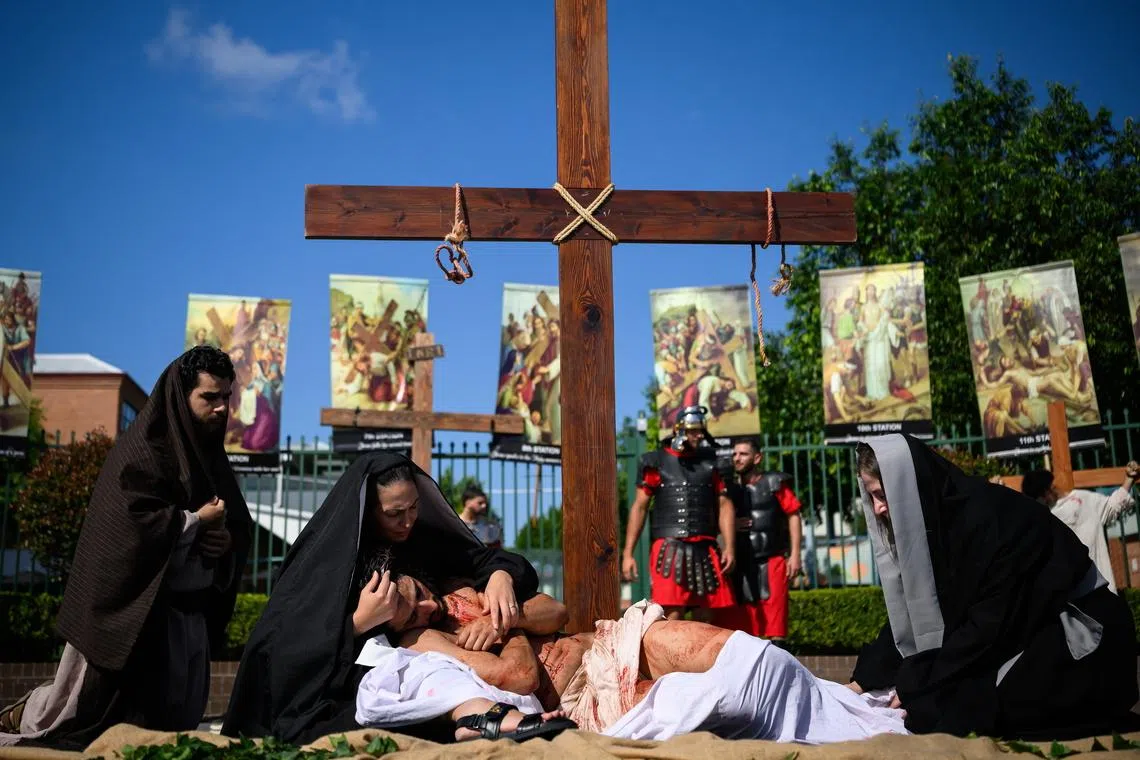 Parishioners re-enacting the Stations of the Cross during a Good Friday service at St Charbel’s Maronite Catholic Parish in Sydney, Australia.