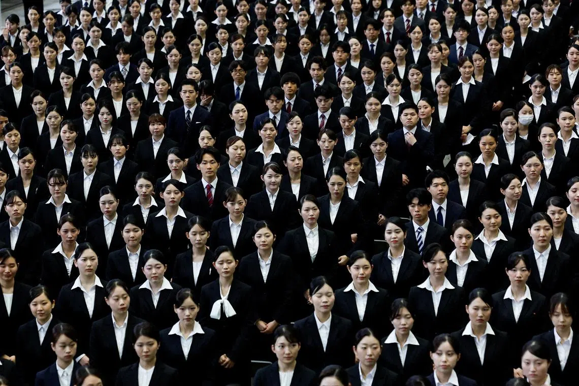 Newly hired employees of Japan Airlines Group attending an initiation ceremony in a hangar at Haneda Airport in Tokyo.