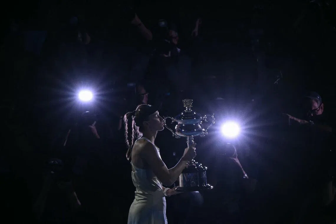 Kazakhstan's Elena Rybakina kissing the winning trophy after her victory against Belarus' Aryna Sabalenka in the women's singles final match of the Australian Open tennis tournament in Melbourne, Australia.