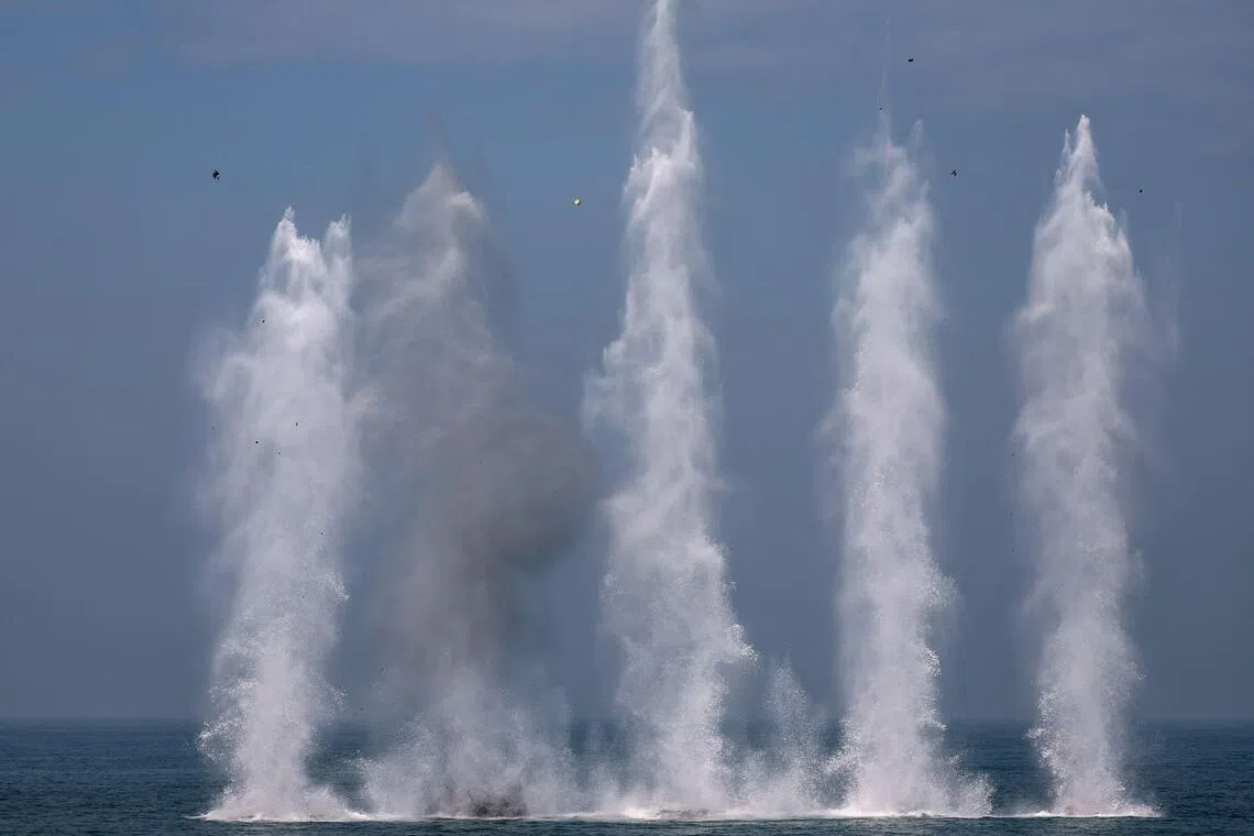 Columns of water shooting upwards after an explosion during the spring military drills at the Tsoying Naval Base in Kaohsiung, Taiwan.
