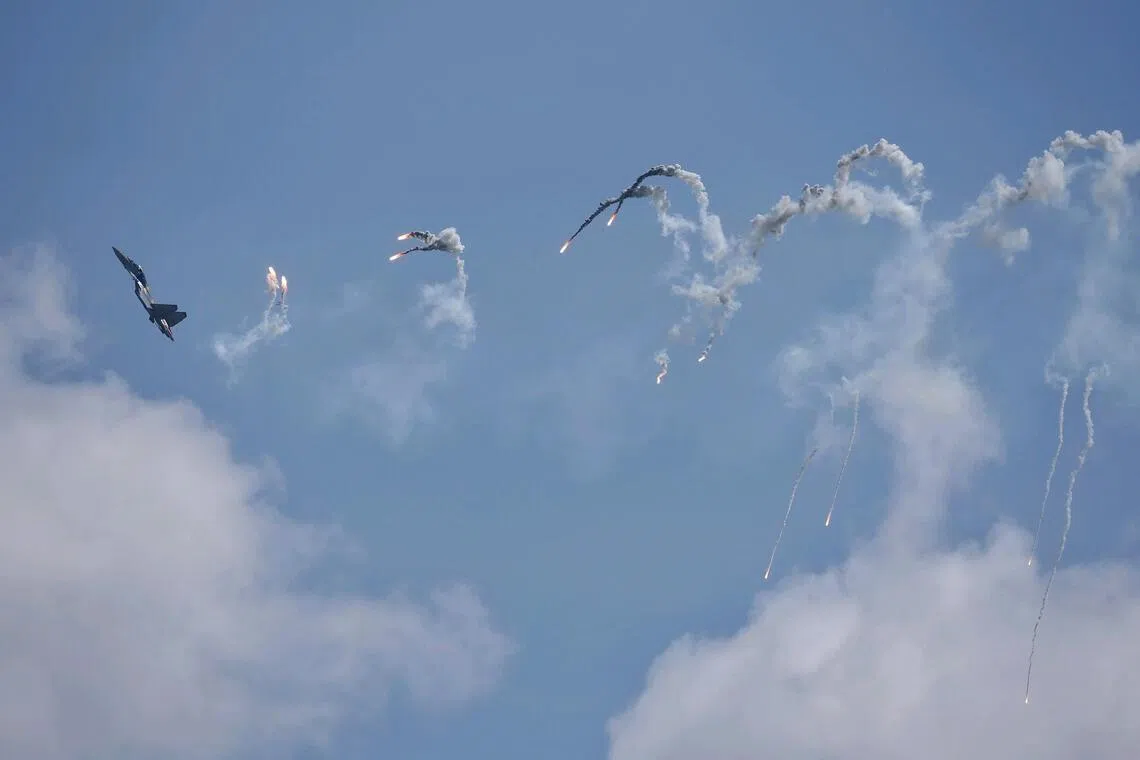 A solo aerobatic display by the SU-30MKM fighter jet from the Royal Malaysian Air Force entertaining the crowd during a media preview at the Singapore Airshow at Changi Exhibition Centre from Feb 3 to 8.