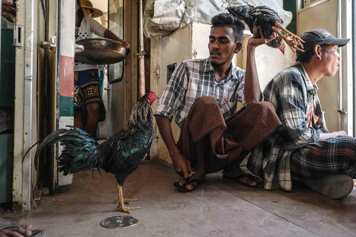 A man watching over his chicken after allowing it to roam free on the Circular Railway train in Yangon, Myanmar. The railway is a 45.9km commuter rail loop with 39 stations that connects the city centre to its suburbs.