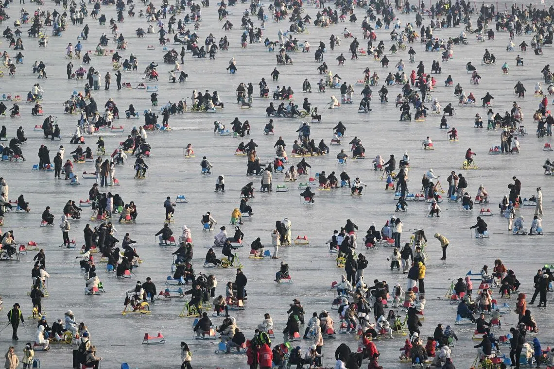People chair-skiing at the Summer Palace ice rink in Beijing, China. The rink is a 160,000 sq m seasonal natural ice rink on Kunming Lake, open every year from late December to early February.