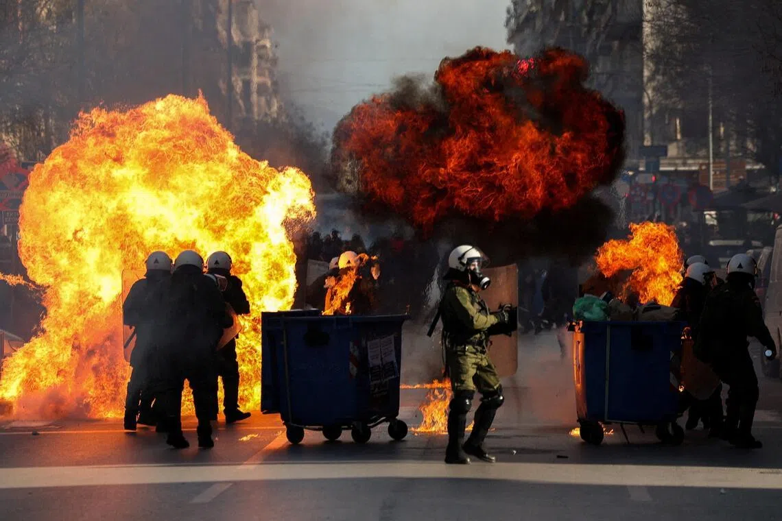 A Molotov cocktail exploding near riot police during clashes at a demonstration marking the anniversary of the 2023 deadly train crash in Tempi, the country's worst railway disaster on record, in Thessaloniki, Greece.