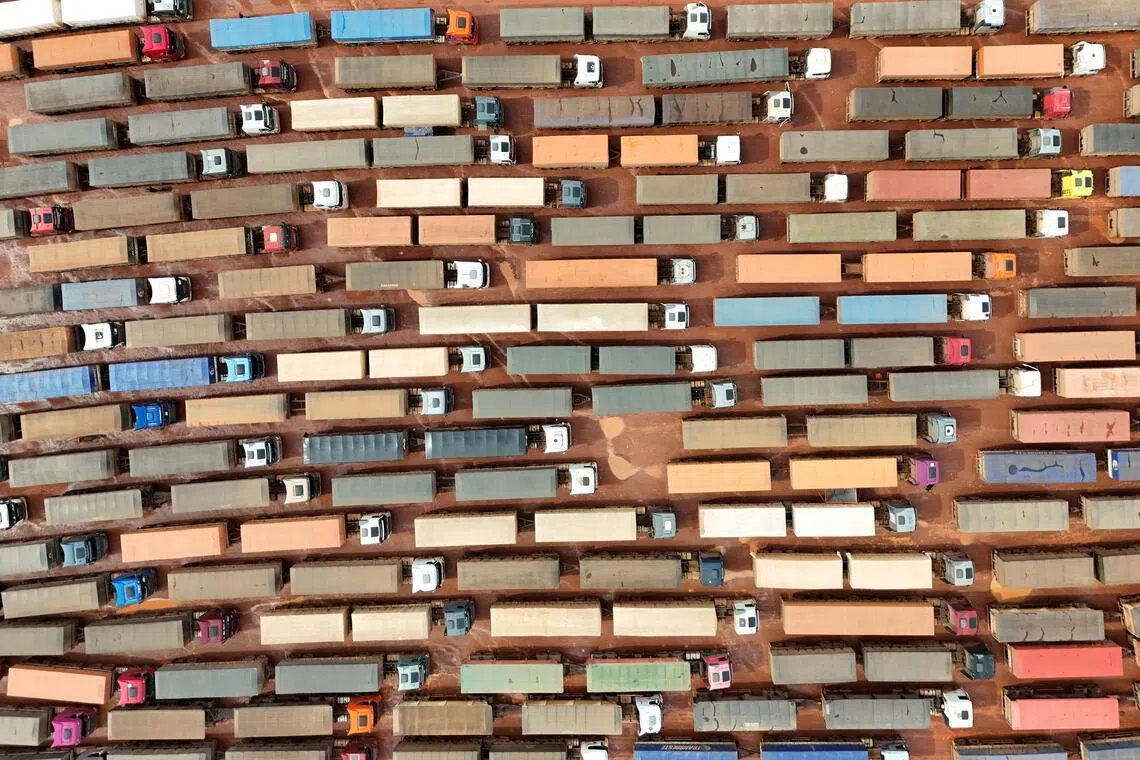 A drone view of trucks loaded with soybeans waiting to unload at the port of Miritituba as heavy grain traffic in the region has led to long lines during Brazil's harvest shipping season, in Miritituba, Brazil.