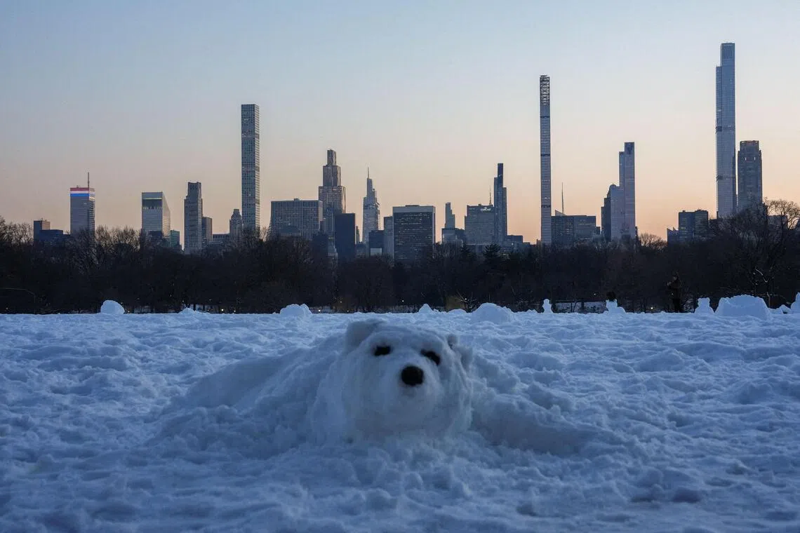 A snow sculpture of a polar bear in front of the Manhattan skyline at sunset in Central Park in New York City, US.