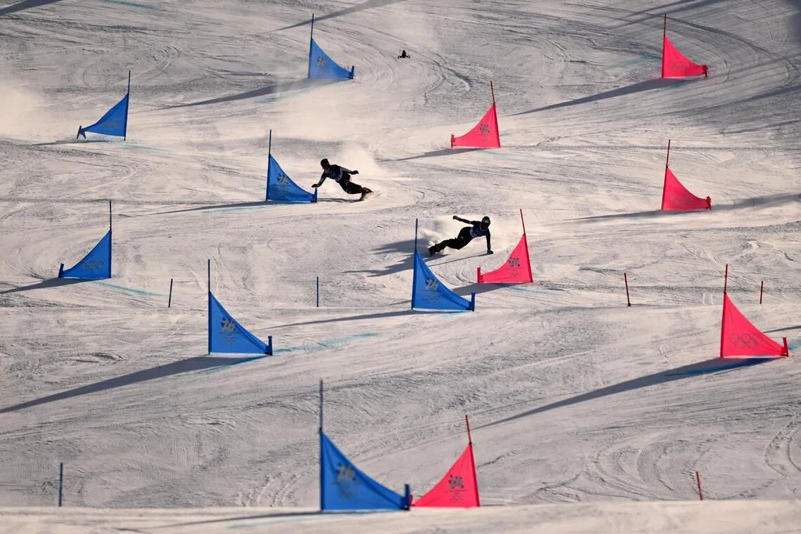 Snowboarders Ester Ledecka of Czech Republic and Aurelie Moisan of Canada in action at the Women’s Parallel Giant Slalom Elimination Run in Livigno Snow Park, Italy.