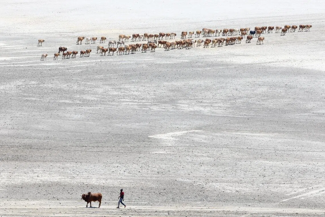 A Maasai pastoralist leading emaciated cattle affected by the worsening drought due to the failed rainy season, as they walk on a dried river bed towards a watering point from their settlement near Magadi township of Kajiado, Kenya.