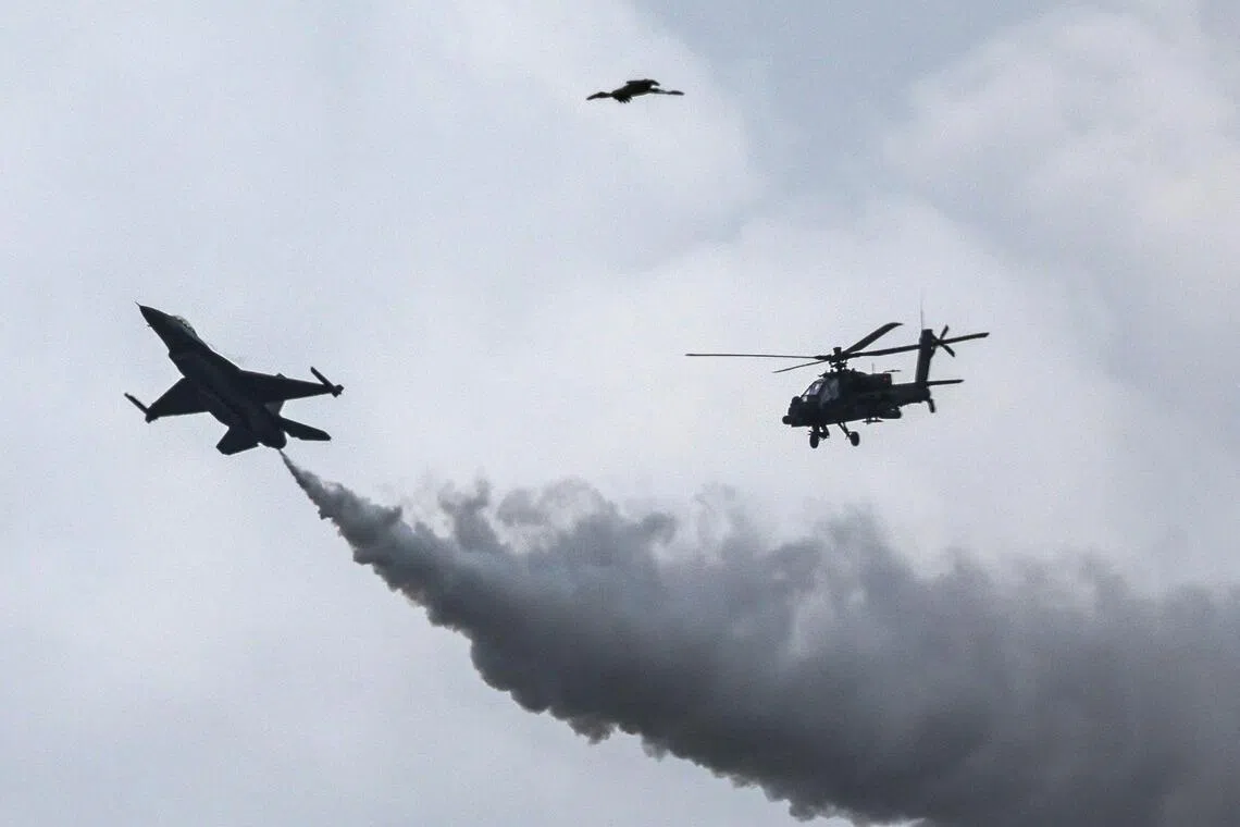 Visitors watching a Republic of Singapore Air Force AH-64D Apache attack helicopter, a F-16C fighter jet and a bird at the Singapore Airshow 2026.